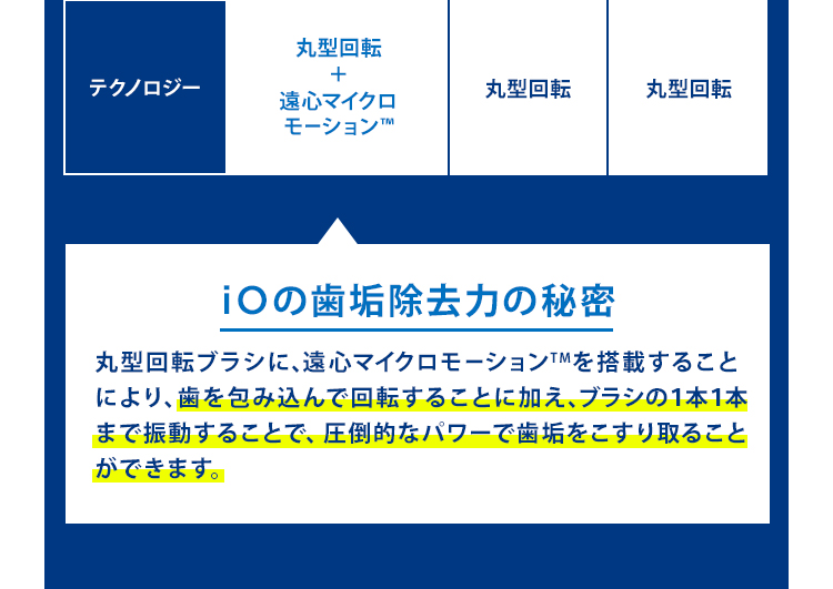 歯の1本1本を包み込んで高速上下運動、左右反転運動で、水には溶けにくい歯垢を、たたいて浮かしてこすり取るからすみずみまですっきりきれいになります。
