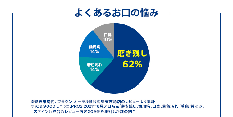 お口のお悩みのうち約62%の方が磨き残しを気にしており、他にも着色汚れ、歯周病、口臭のお悩みを抱えています。